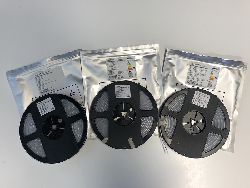 A beérkező új termékek vizsgálatát mindig elsőként szemrevételezéssel, vizuális mintavételezéssel kezdjük. Ez mind az értékesítőnek és a felhasználónak fontos, mivel egy termék minőségét maga a csomagolás, a termékek összeszerelési pontossága is befolyásolja. A minőségi gyártótól tehát elvárható, hogy az új termékei is magasan tükrözzék a korábbi termékek minőségét és azokkal kompatibilisek legyenek. Ez a mi szakmánkban is úgy történik, mint amikor egy almás telefont bontunk ki éppen, szükség van a Hype érzésre. A vizsgált LED szalag a szokásos antisztatikus ezüst csomagolásban érkezett, a címkézés nagyon rendben van, ami azt jelenti, hogy látható a gyártó neve, a termék leírása és minden a LED szalag felhasználásához szükséges. A csomagolást kibontva a LED szalag a szokásos műanyag rolnira van feltekerve, rajta szintén megtalálható a gyártói címke az összes paraméterrel ráadásul külön feltüntetve a hideg és a meleg fehér LED chipek fényáramát. Ez pont az a paraméter ami a hazánkban forgalmazott legtöbb NoName LED szalag esetében nincsen megadva, tehát semmilyen lehetőségünk nincsen arra vonatkozóan, hogy fénytechnikai adatokkal számításokat végezzünk. Maga a szalag amit kaptunk az IP65 védelemmel rendelkezik. Ez a típus ellenáll a víznek és a pornak is, tehát bármilyen környezetbe telepíthető, kivéve, hogy víz alá nem tehető. A LED szalagot egy vékony hasáb formájú burkolatba tették, amin nincsen ragasztó csík. Ez nem is baj, mivel ezek amúgy sem használhatók ezeken az anyagokon, tehát a ragasztást a felületnek megfelelően kell megoldani ha szükséges. A nyák nagyon precíz, a vágási pontok jól láthatók, a hideg forrasztások minőségiek, a chipek elhelyezése a nyákon jól átgondolt és egyenletes, a szükséges feliratok jól láthatók és a márkanév is fel van tüntetve.