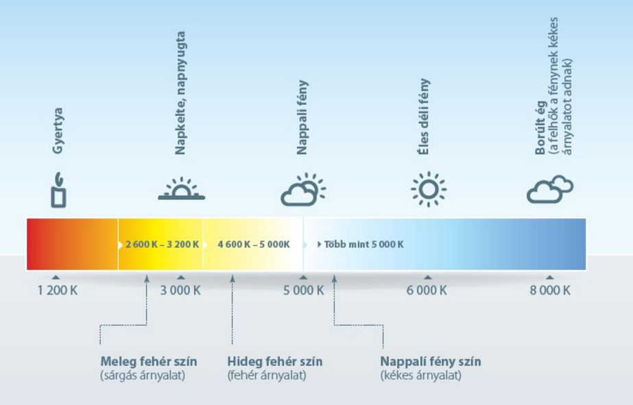 3. Színhőmérséklet: Miután sikeresen terveztél és kiszámoltad a teljesítményeket, keresd a megfelelő lámpatest kategóriákat és a lehetséges termékeket, majd válaszd ki a színhőmérsékletet. Ehhez segítséget ad az alábbi táblázat. Ha sikeresen kiválasztottad akkor erre linkre kattintva máris a kosárba teheted a termékeket. Ha további segítségre van szükséged, vedd fel velünk a kapcsolatot. Az általunk forgalmazott LED termékeknél a meleg színt 2700-3200K, a természetes fehéret 4500K és a teljesen hideg fehéret 6000K paraméterekkel találod meg.